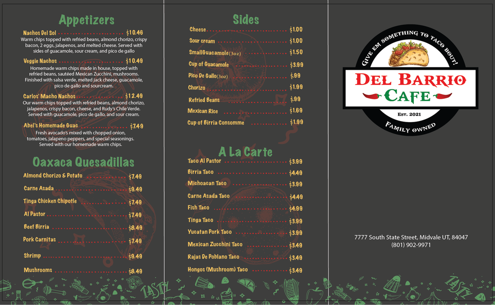 Del Barrio Cafe is a Mexican restaurant located at 7777 S State St in Midvale, UT, offering a variety of traditional Mexican dishes. The menu features appetizers like Abel's Homemade Guacamole and Pork Chile Verde Chorizo Dip, as well as beverages such as Horchata and Mojito Lemonade. Customers rave about the birria tacos, chili verde burrito, and cheesy al pastor tacos. The atmosphere is casual, with friendly service and a cozy vibe. Prices are on the higher side, but patrons believe the quality of the food justifies the cost. The menu boasts many vegetarian options and offers amenities like outdoor seating, delivery, and catering. Del Barrio Cafe is praised for its flavorful dishes and homemade chips, making it a go-to spot for delicious Mexican cuisine.